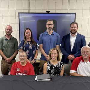 Standing, from left, are Nicolette Secrest, Dental Assisting instructor; Garrett Cox, Welding instructor; Michele Grant, Director of Career-Technical Education; Tom Walsh, Precision Machining instructor; Matt Shreve, Principal at Belmont Career Center; and Jason Donley, Assistant Treasurer/Budgetary.
