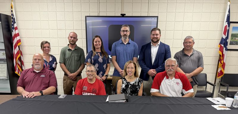 Seated, from left, are Treasurer Mark Lucas; Board Vice President Jason Ayers, Bellaire; Superintendent Heather Austin; and Board President Mike Fador, St. Clairsville.